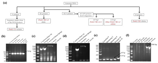 Among the newly designed Pinb2 primers, primer pair D can be used to amplify Pinb2-7D1, and primer pair U can be used to amplify all three homoeologous Pinb2 genes (Figure 4f). Primer pair B1 is designed to specifically amplify the Pinb2-7B1-v3 allele as a ~1326 bp PCR product (Figure 4c). Nested primer pairs B2 and B3 can be used to detect Pinb2-7B1-v2 alleles [64]. Further, a pair of dCAPS primers (primer pair C) was designed specifically for the Pinb2-7B1-v2-1 allele. BstX I digestion, after amplification by primer pair C, distinguishes the Pinb2-7B1-v2-1 allele (107-bp product) from the Pinb2-7B1-v2 allele (135-bp product), which only has an SNP difference (Figure 4e). Therefore, primer pairs B1, B2/B3 and the dCAPS primers form a sequential pipeline for detecting the alleles of Pinb2-7B1.