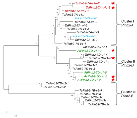 Phylogenetic tree of Pinb2 variants highlights that these sequences are clustered according to the loci where they are located. Phylogeny of Pinb2 alleles was constructed using the neighbor-joining method with 1000-time bootstrap and the substitution model of Kimura 2. Different Pinb2 alleles from different Triticeae species in this study are labeled in different colors. The Pinb2 alleles from durum wheats were labeled in blue color, bread wheat in black, T. urartu in red, Ae. tauschii in green. The new alleles identified in this study are indicated using red stars.
