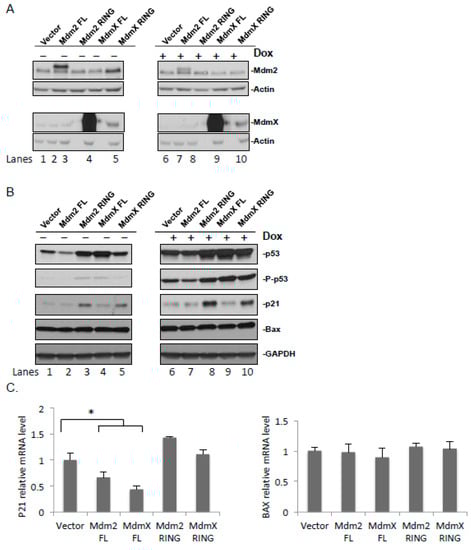 External stress stimuli, such as DNA damage, stabilize and activate p53, which in turn regulate transcription of its target genes. To further elucidate the effects of the ectopically expressed Mdm2 and MdmX RING domains on the transcriptional activity of p53, the expression of its downstream target genes, p53-mediated expression of p21 involved in regulation of the cell cycle progression and a proapoptotic Bax protein was investigated (Figure 3B,C) [33,34]. Ectopic expression of Mdm2 RING led to highly increased p21 levels in the presence and absence of DOX. MdmX RING also caused p21 increase, but to a lesser extent compared to Mdm2 RING. The enhancement was considerably greater in the DOX treated samples likely due to the greater amount of activated p53 detected after treatment. In both doxorubicin-untreated and -treated cells, overexpression of Mdm2 FL or MdmX FL led to decreased p21 protein levels. This is consistent with the role of Mdm2 as p53 E3 ligase and MdmX as a potent inhibitor for p53 transactivation. Similar results were observed for CDKN1A mRNA levels, suggesting that p21 regulation occurs at both the transcriptional and the protein level. However, no changes were observed in Bax protein and mRNA levels as a result of overexpression of the exogenous proteins.