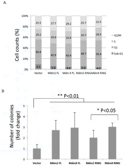 U2OS cells were transfected with pcDNA3.1/FLAG empty vector, FLAG-Mdm2 FL, FLAG-Mdm2 RING, FLAG-MdmX FL, and FLAG-MdmX RING. Following a 24-hour transfection, cells were fixed in 70% ethanol. After fixing, cells were washed with a staining buffer (0.2% Triton X-100, 1 mM EDTA in 1X PBS). Cells were mixed with staining buffer and RNAseA (100 µg/mL). Cells were stained by propidium iodide (Sigma Aldrich, P4864) for 1 hour. Samples were analyzed in a BD FACScalibur. Analysis was performed in CellQuest Pro (BD Biosciences, San Jose, CA, USA).
