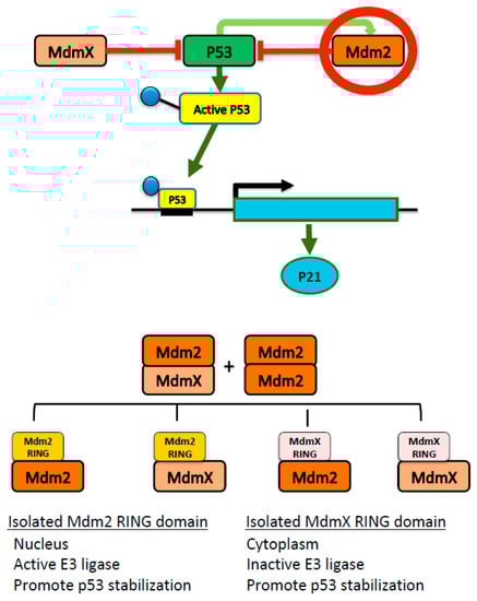 Cartoon scheme of p53-Mdm2-MdmX interplay. Aberrant overexpression of Mdm2 RING domain may dimerize with the full-length Mdm2 or MdmX resulting in inhibition of Mdm2 E3 ligase activity, MdmX stabilization and impaired p53 transcription.