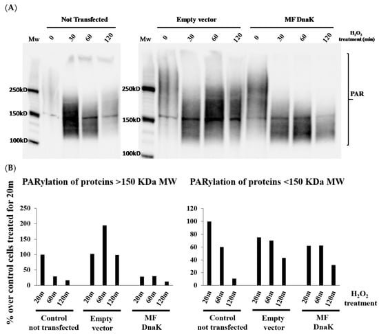 HCT116 cells (ATCC) were plated in 6-well plates at concentrations of 150,000 cells/well. After 24 h, cells were transfected with an expression vector containing M. fermentans MF-I1 DnaK. After about 32 h, cells were treated with H2O2 (750 μM) for the indicated time. Cells were then harvested, lysed in cell lysis buffer in the presence of protease inhibitors, subjected to SDS-PAGE 6%, and analyzed by Western blot. Anti-PAR monoclonal antibody (10H) was from Millipore Sigma. MW are indicated.