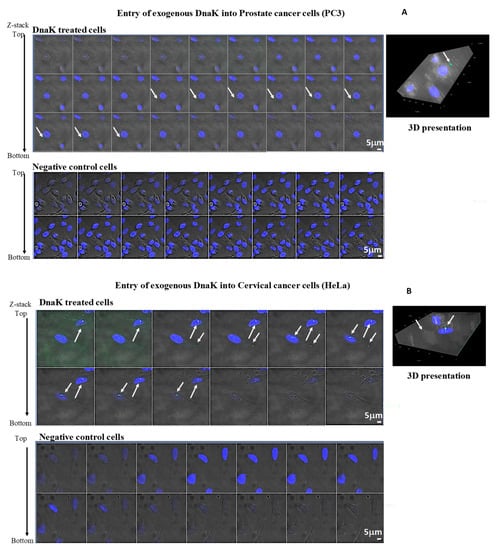 Intracellular uptake of exogenous DnaK-V5 by mycoplasma-free in PC-3 (A) and in HeLa cells (B). Confocal images of exogenous DnaK-V5 protein of M. fermentans in cells treated or not treated with DnaK-V5 protein. The figures show the collected Z-stacks of the corresponding gallery of images, each presenting a 0.5-µm-thick slide. A mouse monoclonal antibody, anti-V5, was used for primary labeling, and a FITC fluoresce-labeled polyclonal rabbit anti-mouse antibody was used for secondary labeling. Arrows indicates protein localization. Negative control cells, treated with primary and secondary antibodies alone without DnaK-V5 protein, are represented at the bottom of each figure. Insets in the upper right corners of A and B show a corresponding constructed 3D presentation of the protein uptake. Materials and Method for Figure 2, we followed the protocol described in [66] to perform the experiments described. Cell lines were obtained from the ATCC.