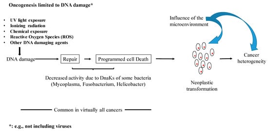 Several different bacteria have been recently associated with the origin of some human cancers, particularly those capable of establishing persistent intracellular infection, affecting host cell cycles and apoptotic pathways, and stimulating the production of inflammatory substances linked to DNA damage, thus potentially promoting DNA mutations and abnormal cell growth. The specific mechanism(s) whereby bacteria transform host cells are poorly understood and precise pathogen-cancer relationships remain largely elusive, except in the case of H. pylori, where a direct causal link has been demonstrated and a p53-related molecular mechanism implicated in cellular transformation has been described [137,145,146]. Based on our data, we propose that mycoplasmas—and perhaps certain other bacteria with closely related DnaK sequences and structure—have oncogenic potential mediated through the DnaK-dependent inhibition of DNA repair mechanisms and p53 function. DnaK could act in concert with some external factors—like smoking—previously shown to hamper the p53-p21 axis-dependent pathways [147]. The presence of some DnaKs would thus prevent the proper coordinated response that the cell engages to repair the DNA lesion following damage. This failure would allow the mutation to be fixed and transmitted along the cellular progeny. After a number of mutations occur, the cell would then transform. Mycoplasmas and certain other bacteria with similar DnaK may then be involved in the initiation of some cancers but not necessarily involved nor necessarily even be present in later stages. It is clearly of biological interest and potential therapeutic relevance to verify these findings in broader studies to understand the physical basis and the mechanism(s) responsible for reduced activities and levels of these critical cellular pathways. These studies may ultimately provide new preventive, diagnostic and therapeutic opportunities.