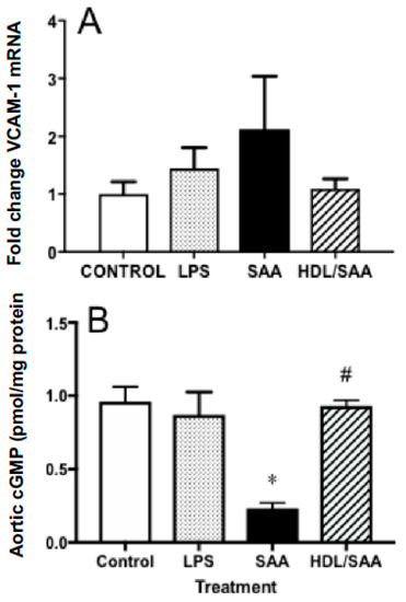 Next, we analyzed the gene expression levels of VCAM-1 in aortic homogenates for the corresponding aorta harvested 4 weeks after commencement of treatment, a period of time suitable to assess early vascular dysfunction. Consistent with increased immune reactivity for VCAM-1, the gene expression of VCAM-1 in the SAA-treated mice increased 50% (reaching ~2.1-fold higher than in the corresponding vehicle control), although this did not reach statistical significance. In mice treated with human HDL prior to stimulation with SAA, the extent of VCAM-1 gene expression was similar to control and LPS groups, although once again this did not reach statistical significance compared to mice treated with SAA alone (Figure 3A).