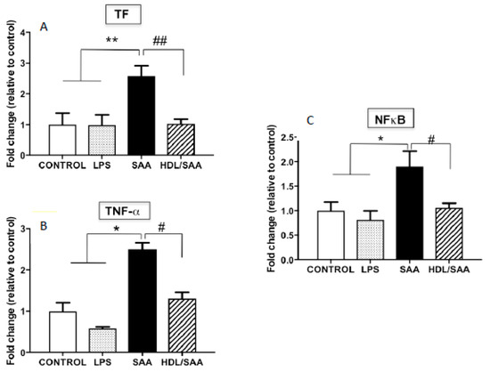 Relative gene expression of selected inflammatory cytokines (TF, TNF-α, NFκB) in mouse hearts. Male ApoE−/− mice were allocated into 4 treatments arms and administered with vehicle (control), LPS, SAA alone, or SAA in combination with HDL. Mice were monitored for 4 weeks after commencement of treatment then sacrificed, and hearts were harvested and processed, as described in the methods section. The extent mRNA expression of TF (A), TNFα (B), and the transcription factor NFκB (C) were determined in heart tissue homogenates by qPCR. Data represent mean ± SD of duplicate analyses from control (n = 5), LPS (n = 5), SAA (n = 5), and HDL/SAA (n = 5) mouse hearts. * Increased significantly relative to vehicle and LPS control groups. Decreased significantly compared to SAA alone group, ** p < 0.001, * p < 0.05, ## p < 0.001, and # p < 0.05.