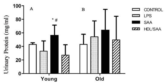 SAA induced increase in urinary protein in SAA treated mice. Male ApoE−/− mice were allocated into 4 treatment arms and administered with vehicle (control), LPS, SAA alone, or SAA in combination with HDL. Urine was collected 4 weeks (left panel A) or 18 weeks (right panel B) after commencement of treatment and analyzed for total protein as described in methods. Data shows mean ± SD for young cohort, with mice numbers control (n = 7), LPS (n = 8), SAA (n = 6), and HDL/SAA (n = 6); and old cohort, control (n = 8), LPS (n = 8), SAA (n = 6), and HDL/SAA (n = 6). * Different to the corresponding control and LPS group, p < 0.05. # Different to the corresponding HDL/SAA group, p < 0.05.