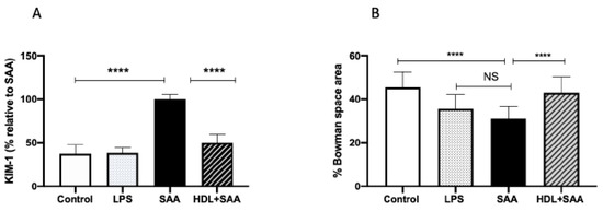 SAA-mediated increase in urinary KIM-1 was prevented by pretreatment with HDL in young mice. Male ApoE−/− mice were allocated into 4 treatments arms and administered with vehicle (control), LPS, SAA alone, or SAA in combination with HDL. (A) Urine was collected 4 weeks after commencement of SAA treatment and analyzed for secretory levels of KIM-1, as described in the methods section. Data represent percentage change with respect to SAA levels where mean values were SAA = 592 pg/mL (representing 100%) with mice numbers control (n = 8), LPS (n = 8), and SAA (n = 8), and HDL/SAA (n = 8). (B) Thin kidney sections were stained with H&E, imaged captured, and the relative percentage area of Bowman’s space was determined using n = 30 glomeruli for each isolated kidney from each treatment group, as we described previously [35]. Data represent mean data from glomeruli present in the field of view (3 fields for each section) with mice numbers control (n = 8), LPS (n = 8), SAA (n = 8), and HDL/SAA (n = 8). * Different to the control and LPS group, p < 0.05. # Different to the SAA and HDL/SAA group, p < 0.05. **** p < 0.0001.