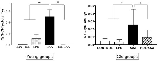 Upon activation, immune cells can produce myeloperoxidase (MPO)-derived oxidants such as hypochlorous acid (HOCl) [36]. This potent two-electron oxidant can induce uncontrolled oxidative damage to tissues. Renal oxidative damage was assessed in renal tissues using 3-Cl-Tyr as a specific biomarker for HOCl-mediated protein oxidation [36]. As we described previously [35], significantly higher levels of 3-Cl-Tyr were observed in young as well as old mice assigned to the respective SAA treatment groups when compared to respective age-matched controls (Figure 9). Interestingly, the ratio of 3-Cl-Tyr/native Tyr was more markedly elevated in the acute response to SAA at 4 weeks than at 18 weeks (A “young mice” compared to B “old mice”). In the presence of supplemented HDL, the SAA-stimulated increase in 3-Cl-Tyr/native Tyr was significantly inhibited, more so in the young than the older mice, once again indicating that added HDL suppressed SAA pro-inflammatory activity.