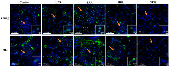 Elevated levels of pro-inflammatory cytokines and increased oxidative damage can promote activation of intracellular kinases [37]. To evaluate renal kinase activity, the level of mitogen-activated protein kinase p38 phosphorylation (p-p38MAPK) was determined using an immune-fluorescent approach (Figure 11). Overall, all tissues showed some level of P38MAPK activation, largely localized to the intracellular domain of epithelial cells within proximal tubules in the renal cortex with little evidence of p-p38MAPK+ immune-positive response within glomeruli (glomerular structures are indicated by orange arrows in all panels as defined by the cluster of DAPI positive cells). Notably, no p-p38MAPK+ immune-positive response was evident in the corresponding negative control (refer to the insets shown in Figure 11), indicating that the antibody targeted the correct antigen. In mice treated with SAA, the level of renal p-p38MAPK+ immuno-reactivity increased relative to the vehicle and LPS controls, and this was more marked in the renal tissue from older mice compared to that from young mice. Notably, animals pretreated with HDL prior to SAA stimulation (HDL + SAA group) showed variable impact on p-p38MAPK+ immuno-reactivity. Specifically, in the older mice the presence of elevated HDL diminished fluorescence intensity to below the level detected in the corresponding age-matched vehicle and LPS controls, whereas in the younger mice the inhibition was less marked (Figure 11).
