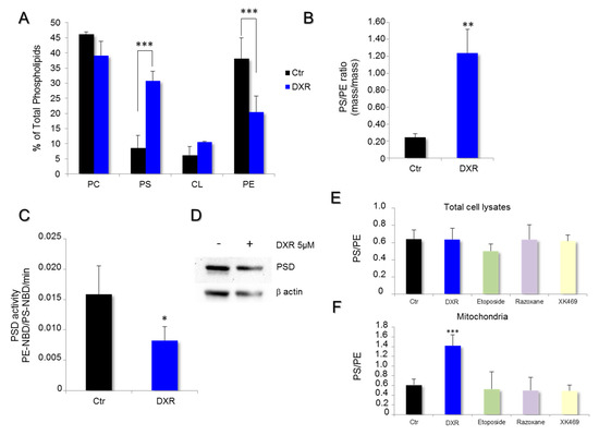 DXR modifies mitochondrial membrane composition of HeLa cells while inhibiting phosphatidylserine decarboxylase (PSD) activity. The effect of DXR on the phospholipid composition of mitochondrial membranes was analyzed by high-performance thin-layer chromatography. (A) The quantification of PC, phosphatidylcholine; PS, phosphatidylserine; CL, cardiolipin; and PE, phosphatidylethanolamine was performed by densitometry and expressed as a percentage of total phospholipids. The mitochondrial membrane composition obtained after 5 μM DXR treatment was compared to that in control conditions. ***, p < 0.001; Multiple t test of two-way ANOVA. (B) The PS/PE ratio was determined in HeLa cells, treated or untreated, with DXR at 5 μM (**, p < 0.01). (C) The rate of PSD activity was determined in vitro on isolated mitochondria using a fluorescent analog of phosphatidylserine, PS-NBD (black). The enzyme activity was also measured in the presence of DXR 5 μM (blue). The data are expressed in PE-NBD/PS-NBD ratio per minute. Each point represents the mean value ± SEM of N ≥ 3 experiments (*, p < 0.05). (D) The expression level of PSD was analyzed by Western blot on cell lysate treated by 5 μM DXR for 24 h, and compared to the untreated cells. The effect of topoisomerase inhibitors on PS/PE ratios was determined from (E) total cell lysates and the (F) isolated mitochondrial fraction. Cells were incubated with 5 μM DXR, 1.25 μM etoposide, 20 μM razoxane, or 10 μM XK469 for 24 h. Then, estimation of the PS/PE ratios was performed. The data are expressed as mean values ± SD with ***, p < 0.001.