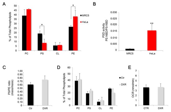 Phosphatidylserine decarboxylase activity is the limiting step in DXR efficiency. (A) The phospholipid composition of mitochondrial membranes was determined on other cells, MRC5, by high-performance thin-layer chromatography and compared to that of HeLa. The quantification of PC, PS, CL, and PE was performed by densitometry and expressed as a percentage of total phospholipids (*, p < 0.05). (B) PSD activity was measured on mitochondrial fractions of MRC5 and compared to those of HeLa cells. The data are expressed in PE-NBD/PS-NBD ratio per minute, as mean values ± SEM of N ≥ 3 experiments (**, p < 0.01). (C) The PS/PE ratio was determined in MRC5 cells treated or untreated with 5 μM DXR. (D) The effect of DXR on the entire mitochondrial membrane composition was assayed. DXR treatment was unable to induce a mitochondrial membrane remodeling within MCR5 cells. (E) The mitochondrial respiration was measured in MRC5 cells treated for 6 h with 5 μM DXR, and endogenous rates of respiration were recorded and compared to the control condition. Data are expressed as mean values of oxygen consumption rates (OCR) ± SEM, N = 5 experiments.