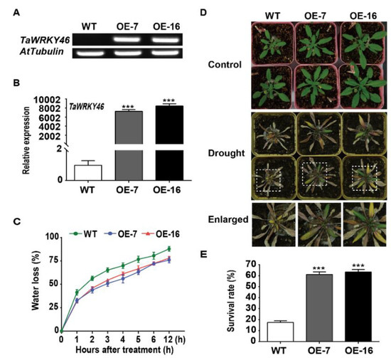 Li, X.; Tang, Y.; Zhou, C.; Zhang, L.; Lv, J. A Wheat WRKY Transcription Factor TaWRKY46 Enhances Tolerance to Osmotic Stress in transgenic Arabidopsis Plants. Int. J. Mol. Sci. 2020, 21, 1321. https://doi.org/10.3390/ijms21041321