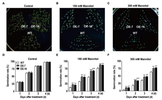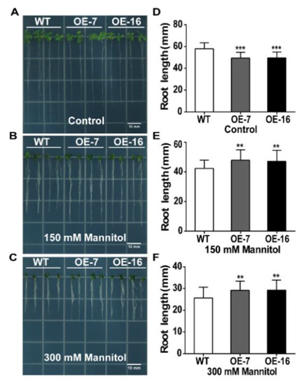 2.4. Overexpression of TaWRKY46 Improved Osmotic Tolerance in Transgenic Arabidopsis Plants