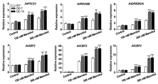 2.5. TaWRKY46 Regulates the Expression of Stress-Related Genes Under Osmotic Stress in Arabidopsis Plants