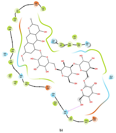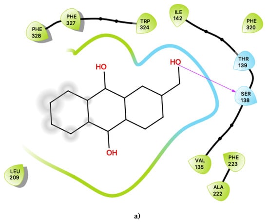 For c34, inspection of the contacts indicates that there are 17 residues within 4 Å distance of the ligand, with a combination of nonpolar, polar and acidic residues. Within the active site (Figure 2a), c34 maintained a number of interactions which are similar to those of lorcaserin [15]. There is a close contact with the highly-conserved Asp 134, for which it is known that its involvement is vital to agonist activity [23,24,25,26]. There are also contacts with a number of phenylalanine residues, including Phe 214, Phe 327 and Phe 328, some of which are mediated via π–π ring-stacking interactions with the polycyclic aromatic rings of c34. These ring-stacking interactions are also supported by contacts with a cluster of surrounding nonpolar sidechains within the binding pocket, including Ile 131, Val 135, Val 208 and Leu 209, as well as close contacts with polar residues, including Ser 138, Thr 139, Asn331 and Asn 351. The ligand c34 is also predicted to be sufficiently close to potentially form hydrogen bonding interactions with another acidic residue: Glu 347. This residue is proximal to the hydroxyl group of the ligand c34. The ligand is also predicted to be in close vicinity of Tyr 118, again with the possibility of potentially forming hydrogen bonding interactions with the c34 hydroxyl group. The combination of an additional interaction with Glu 347 and possible hydrogen bonding with Tyr 118 suggests that c34 may be capable of acting as a more potent agonist than LOR and other previously studied agonists. In particular, the roles of Glu 347 in 5-HT2C interactions with ligands is not presently well-characterised and may be worthy of further study.