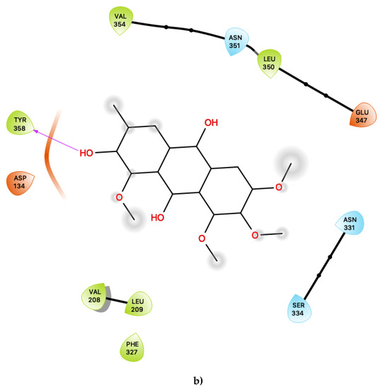 For c29 (Figure 3b), there are likewise 11 residues within 6 Ang of the ligand. Interactions are formed with several aromatic residues. There is a ring-stacking interaction with Phe 327, and a hydrogen bond mediated via the ligand’s hydroxyl group to Tyr 358. This is again supported by a cluster of nonpolar residues: Val 208, Leu 209, Leu 350 and Val 354. Perhaps, most importantly, in addition to the interaction with the known key residue Asp 134, there is also a close contact formed with a second acidic residue, Glu 347. These residues are also predicted for the putative agonists described in the section above.