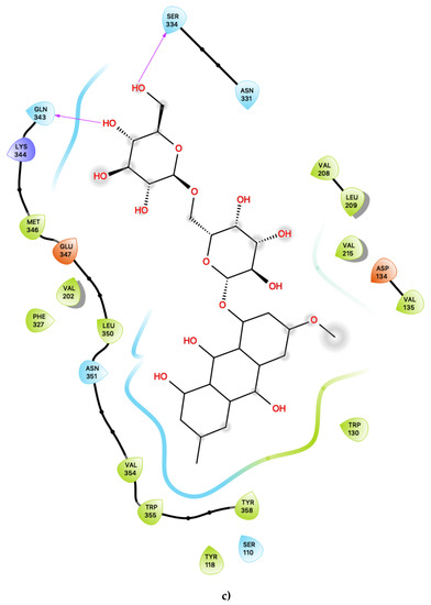Predicted binding affinity for each protein-ligand pair and binding poses of the ligands were generated through the molecular docking process. Binding sites and ligand interactions were analysed with software Maestro [44] from Schrodinger (Schrodinger, New York, NY, USA).
