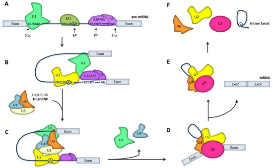 Spliceosome assembly for pre-mRNA splicing. (A) Spliceosome assembly is initiated through binding of the U1 snRNP to the 5’ splice site (ss), SF1 to the branch point (BP), U2AF65 to the polypyrimidine tract (PY), and U2AF35 to the 3’ splice site. (B) Next, the U2 snRNP displaces SF1 and binds the BP. (C) Recruitment of the U4/U6.U5 tri-snRNP. (D) Conformational rearrangements involving the release of the U1 and U4 snRNPs lead to catalytic activation. (E) Ligated exons are released from the spliceosome, and the remaining snRNPs persist, associated with the intron lariat. (F) Subsequently, snRNPs dissociate from the excised intron.