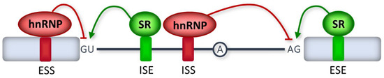 - Wang, Z.; Xiao, X.; Van Nostrand, E.; Burge, C.B. General and specific functions of exonic splicing silencers in splicing control. Mol. Cell 2006, 23, 61–70. [Google Scholar] [CrossRef] [PubMed]