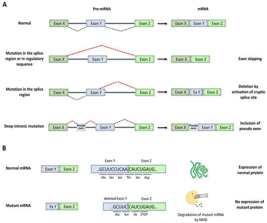 Splice site mutations result in either exon skipping, the activation of a nearby cryptic or alternative 3’ or 5’ splice site, or intron retention (Figure 4A). The use of unnatural splice sites or intron retention frequently changes the reading frame for translation and introduces premature termination codons (PTCs) into mRNA (Figure 4B). Similarly, skipping some exons alters the reading frame and introduces PTCs. In cells, most abnormal mRNA-harboring PTCs are recognized and degraded by a quality-control mechanism termed nonsense-mediated mRNA decay (NMD) [38]. The degradation of PTC-containing mRNA by NMD prevents the translation of truncated proteins with potentially deleterious gain-of-function or dominantly negative activity. Thus, in most cases, splice site mutations result in the inactivation (loss of function) of the mutated allele. However, some mRNA-containing PTCs escape NMD and are translated into truncated proteins. If the skipped exon does not alter the reading frame, then a shorter protein will be synthesized. In other cases, the mutations induce the expression of alternatively spliced protein isoforms with different functional properties: rather than create an aberrant (cryptic) splice site usually associated with a loss of function, these mutations shift the ratio of expression of natural protein isoforms.
