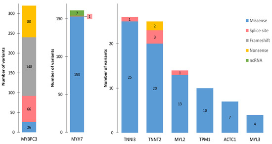 Hypertrophic cardiomyopathy (HCM) mutations. The bar graphs depict the number and type of HCM-associated variants in the indicated genes. All variants reported as pathogenic or likely pathogenic in the National Center for Biotechnology Information’s ClinVar database (http://www.ncbi.nlm.nih.gov/clinvar/) were considered.