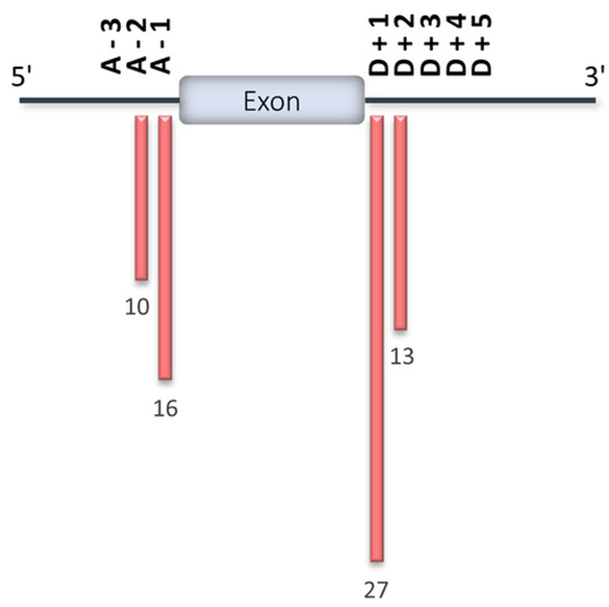 - Zhang, S.; Samocha, K.E.; Rivas, M.A.; Karczewski, K.J.; Daly, E.; Schmandt, B.; Neale, B.M.; MacArthur, D.G.; Daly, M.J. Base-specific mutational intolerance near splice sites clarifies the role of nonessential splice nucleotides. Genome Res. 2018, 28, 968–974. [Google Scholar] [CrossRef]