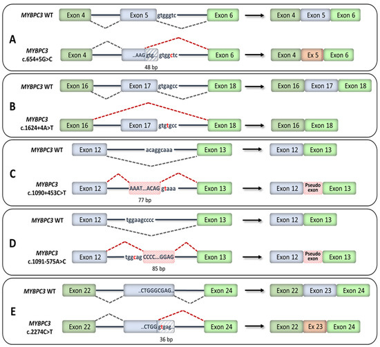 Recently reclassified MYBPC3 splicing mutations. Exons are represented by boxes and introns by lines. Exonic nucleotides are indicated by capital letters and intronic nucleotides by small-case letters. (A) Variant c.654+5G>C created a cryptic donor splice site within exon 5, leading to a truncated exon with an in-frame deletion of 48 pb [63]. (B) Variant c.1624+4A>T caused the skipping of exon 17, leading to a frameshift [63]. (C) Deep intronic variant c.1090+453C>T created a new splice donor sequence, which led to the inclusion of a 77-bp pseudo-exon in the mRNA, causing a frameshift and the introduction of a premature termination codon (PTC) [62]. (D) Deep intronic variant c.1091-575A>C created a new splice acceptor sequence, which led to the inclusion of an 85-bp pseudo-exon in the mRNA, causing a frameshift and the introduction of a PTC [62]. (E) Synonymous variant c.2274C>T (p.Gly758Gly) caused the truncation of exon 23 by 36 nucleotides, leading to an in-frame deletion of 12 amino acids [62].