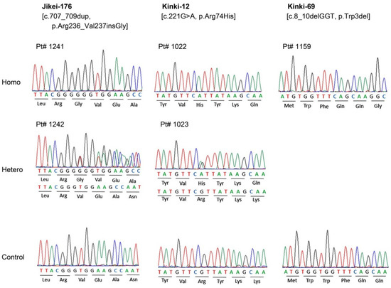 Three homozygous DRAM2 variants were identified by WES with target analysis of retinal disease-associated genes, viz., c.707_709dup, p.Arg236_Val237insGly in one family (Jikei-176); c.221G>A, p.Arg74His in one family (Kinki-12); and c.8_10delGGT, p.Trp3del in one family (Kinki-69) (Figure 1, Tables S1 and S2). These three variants have not been reported as disease-causing. Two families, Jikei-176 and Kinki-69, had histories of consanguineous marriages (Figure 2).