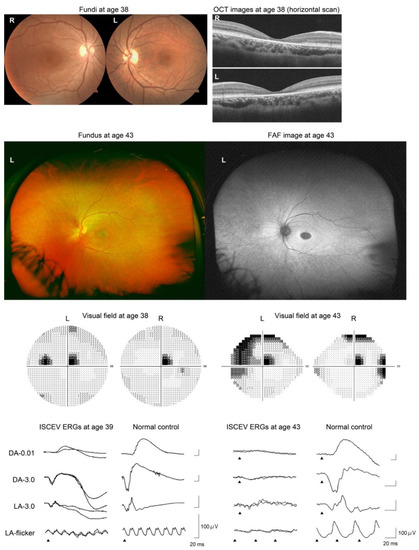 Patient 1 (Jikei-176-1241, Figure 3) was a generally healthy 38-year-old Japanese woman. Her parents were first cousins, as shown in Figure 2. She noticed a difficulty in night vision at age 19 years and reduced visual acuity at age 37 years. Initial funduscopy at age 38 years showed fine white dots in the macula, and granular macular degeneration appeared 5 years later, at age 43 years. Fundus autofluorescence (FAF) imaging at age 38 years showed abnormal hypo-autofluorescence surrounded by a ring-shaped hyper-autofluorescence in the macula. Five years later, additional abnormal hypoautofluorescence areas appeared in the midperiphery. The optical coherence tomographic (OCT) images showed a disrupted ellipsoid zone and thinning of the outer retinal layers at the macula. Visual field tests revealed a central scotoma at age 38 years, and peripheral field defects appeared at age 43 years. The full-field electroretinograms (ERGs) were subnormal for both rod and cone responses at age 39 years, and they were almost nonrecordable 4 years later at age 43 years (Figure 3).