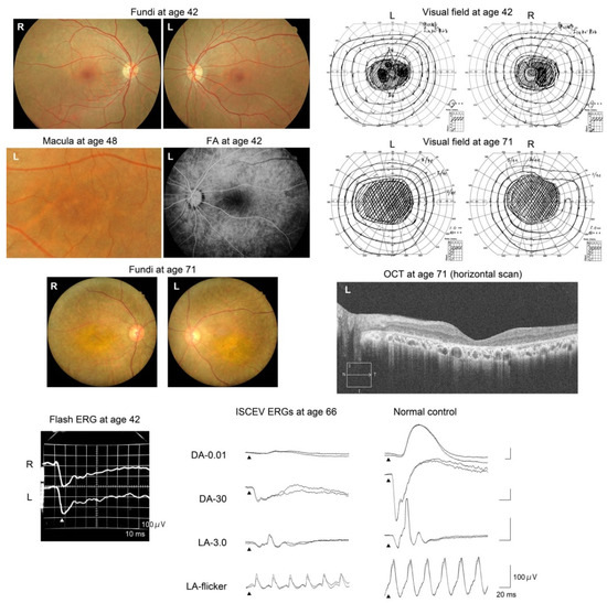 Patient 3 (Kinki-69-1159, Figure 5) was a 42-year-old Japanese woman when she first visited our clinic. She reported that she had had difficulty seeing in dark environments for several years. Her fundi showed slight color changes of the RPE. Fine yellow dots were observed in the macula, and the retinal vessels were normal. The degeneration gradually progressed, and the retinal vessels became narrower. However, pigmentation of the retina was still sparse when she was 71 years old. Goldmann kinetic perimetry showed a large ring scotoma when she was 42 years old. She lost her residual central vision at age 55 years when her decimal visual acuity had decreased to 0.01 OD and hand motions OS (Table 1). The b-waves of the flash ERGs at age 42 years were reduced, resulting in a negative-type ERGs (Figure 5). The rod ERGs at age 66 were almost nonrecordable, but cone ERGs were reduced but recordable, i.e., rod-cone dystrophy. Her OCT images showed an absence of the outer layer of the retina in both eyes (Figure 5).