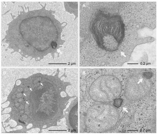 Transmission electron microscopic images of the peripheral lymphocytes in Patient 1. The left column shows the entire images of lymphocytes, and the right column shows the magnified images focusing on myelin-like lamellar structures. The images show myelin-like lamellar structures (arrows) around the nucleus (A) and mitochondria (B).