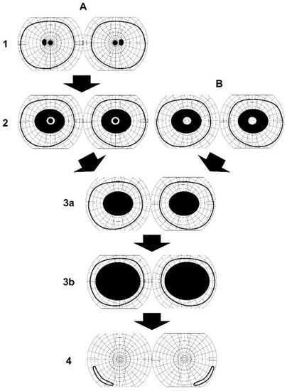 Schematic progression of the visual field defects in patients with DRAM2-associated retinopathy. A central scotoma appears initially (A1) followed by large ring scotoma (A2). They combine resulting in a large central scotoma (3a,3b). Ring scotoma may appear initially (B2). The residual central vision will be lost resulting in a large central scotoma (3a,3b). Both types A and B have poor visual outcome (4).