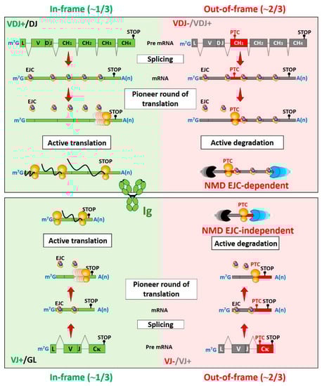 In recent decades, several laboratories, including ours, have contributed to the understanding of how PTC-containing Ig mRNAs are degraded by NMD [5,73,92,93,94,95,96,97]. As exemplified for Ig heavy (IgH) and light (IgL) chain genes (Figure 1), the imprecise nature of V(D)J recombination generates ~1/3 of in-frame and ~2/3 of out-of-frame V(D)J junctions. Nonproductive V(D)J junctions can lead to the appearance of PTCs at the end of the variable (V) exon or in the downstream adjacent constant exon. For IgH mRNAs that contain several constant exons, the presence of PTC in the V or CH1 exon elicits EJC-dependent NMD. By contrast, PTC-containing IgL mRNAs do not conform to the −50 nt boundary rule and harbor PTCs close to or within the last constant exon. Therefore, many B-lineage cells express PTC-containing Ig mRNAs that can activate both EJC-dependent and -independent NMD modes [82].