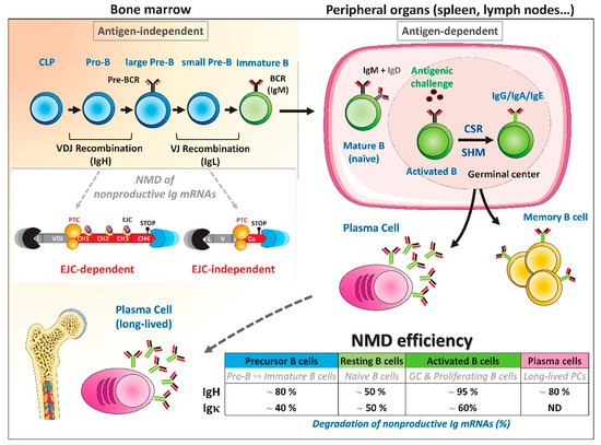 NMD assessment during B-cell development. Early B-cell development takes place in bone marrow through antigen-independent stages. B cell precursors undergo a first round of DNA rearrangements, between VH, DH, and JH segments located in the 5′ region of the Ig heavy (IgH) chain locus. V(D)J recombination is initiated by DH to JH rearrangements at the pro-B stage and followed by VH to DJH recombination. At the large pre-B stage, a productive (P) VDJ rearrangement encodes membrane Igµ chains that can associate with surrogate light chains to form the pre-B cell receptor (pre-BCR). Provided appropriate pre-BCR signaling, V to J rearrangements will be initiated at Ig light chain loci in small pre-B cells, leading to the expression of a functional BCR at the immature B cell stage. Once positively selected, mature B cells migrate to the periphery. Upon antigen stimulation, B cells proliferate in germinal centers (GCs) and further diversify their Ig repertoire through class switch recombination (CSR) and somatic hypermutations (SHM). Activated B cells can then differentiate into memory B cells or plasma cells (PCs). PCs will return to bone marrow niches in which they can survive for several years. Mouse models have been used to quantify the extent of degradation of nonproductive (NP) Ig mRNAs during B-cell development [94,97]. Fluctuations of NMD efficiency are depicted in the lower right table. A very active EJC-dependent NMD is elicited for NP IgH mRNAs, with almost complete disappearance of PTC-containing IgH mRNAs in activated B cells [97]. In contrast, the magnitude of EJC-independent NMD is far lower for NP IgL mRNAs, with only 60% of degradation in activated B cells [94]. ND: not determined.