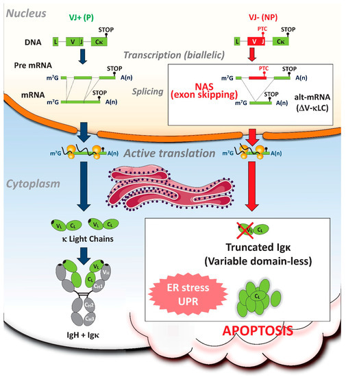 Consequences of NAS on Igκ transcripts in antibody-secreting plasma cells. Because most B-lineage cells harbor nonproductive (NP) Ig gene rearrangements [82,83], the boost of Ig gene transcription accompanying their plasma cell (PC) differentiation generates considerable amounts of nonsense Ig transcripts. In PCs with biallelic (VJ+/VJ−) Igκ rearrangements, the presence of premature termination codons (PTCs) activates NAS with skipping of the variable (V) exon. Remarkably, alternative V-less κ light chain (ΔV-κLC) mRNAs encode truncated Ig chains (lacking V-domain) which induce PC apoptosis through exacerbated ER stress and unfolded protein response (UPR) [106]. By eliminating numerous PC clones with biallelic Igκ rearrangements, in an antigen-independent mode, this novel truncated Ig exclusion (TIE) checkpoint reveals that NP Ig alleles can sometimes be drivers, rather than passengers. Altogether, the production of harmful truncated Ig provides evidence for deleterious NAS activation, confirming the assumption that this RNA surveillance process is highly risky and purposeless.