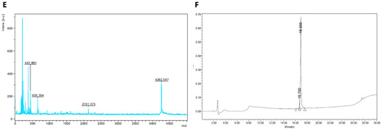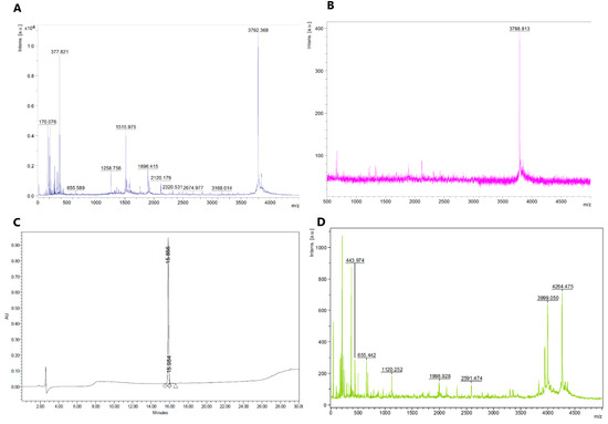 Peptide purification was achieved by a preparative reverse-phase HPLC system consisting of a Waters 600 Pump, In-line Degasser, 600 Controller, and 2996 Photodiode Array Detector. The column used was a Waters XSelect Peptide CSH C18 OBDTM, 5 µm, 19 mm × 250 mm with H2O/ACN gradient. Fractions were concentrated and lyophilized. An analytical reverse-phase HPLC system was used to determine purity of the product, consisting of a Waters 717 plus Autosampler, In-line Degasser AF, 600 Controller, and 2996 Photodiode Array Detector; the column used was a Waters Symmetry C18, 5 µm, 4.6 mm × 250 mm on an H2O/ACN gradient. The products were characterized by matrix-assisted laser desorption/ionization time-of-flight mass spectrometry (Bruker Microflex) using α-cyano-4-hydroxycinnamic acid as matrix.