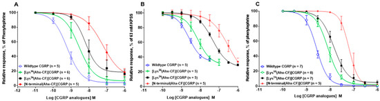 Generally, wild-type h-α-CGRP and its three fluorescent analogues induced comparable vasodilator responses in isolated arteries from all three species (mouse, rat, and human) with similar efficiency but with different potency. Because potency depends on both affinity and effect, the observed activity of the peptides proved to be similar, and hence these four peptides appear to possess different binding affinities for the CGRP receptor. This is somehow expected, as tagging of the peptide may induce conformational/structural modifications leading to changes in affinity for the receptor. However, the potency assessed in functional studies depends on both affinity and efficacy [36]. In functional studies, especially when dealing with complex receptors such as G-protein-coupled receptors (GPCRs), the potency of the ligand can be affected by intracellular signaling (i.e., efficiency of receptor–effector coupling and stimulus–response amplification). However, further studies are needed to verify this. Moreover, our data show that the N-terminal part of the peptide is the most important for high affinity, as fluorescent tagging at the N-terminus of h-α-CGRP conferred the most pronounced loss of potency across all three species. Previous studies have also emphasized the functional importance of the N-terminal part by showing that its extension by a single tyrosine residue or a biotin moiety leads to a decrease in the potency of the peptide by 10–40-fold and 150-fold, respectively [1,4,37].