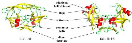 The presence of an additional α-helical insert was first observed in the crystal structure of EIAV PR [26]. This region, which adopts an α-helical conformation, is located in the flap elbow, near the conserved active site motif (Figure 1). The structural role of this additional helix has been revealed by molecular dynamics simulations suggesting its determinant role in the flexibility of the flaps [8]. Despite the relatively higher rigidity of flap movement, the tips of the flaps have high flexibility in Ddi PRs, and thus, they are not defined fully in most structures by electron density maps.