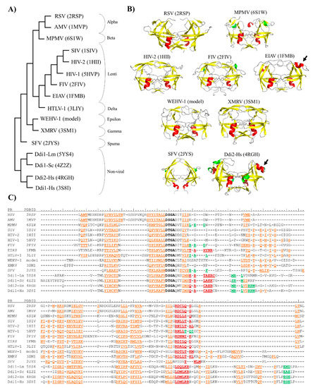 Evolutionary relationships were investigated by multiple alignment of PR sequences and structures. In the comparison, all seven genera of exogenous retroviruses were represented, and a previously prepared set of retroviral PRs [70,72,73] was complemented with eukaryotic Ddi1 and Ddi2 retroviral-like PRs with experimentally determined structures. The result of the sequence-based analysis is shown later in the Discussion.