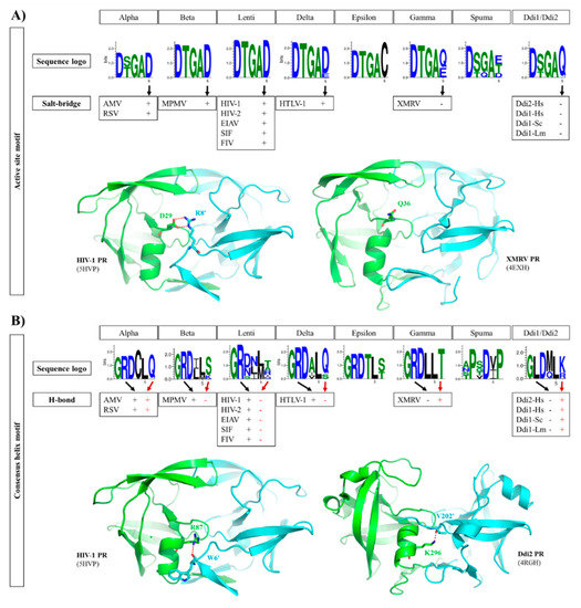 The structures of homodimeric retroviral and retroviral-like aspartic PRs share the same protease fold. Each subunit consists of mainly β-strands, but the presence of a consensus short α-helix near the C-terminus is also a common feature that encompasses one of the most conserved sequence motifs of these enzymes. This α-helix contains G-R-N motif in HIV-1, HIV-2, and SIV PRs, whereas G-R-D motif is present in other lentivirus PRs and in all other retroviral genera members, excepting spumaretroviruses (Figure 5B).