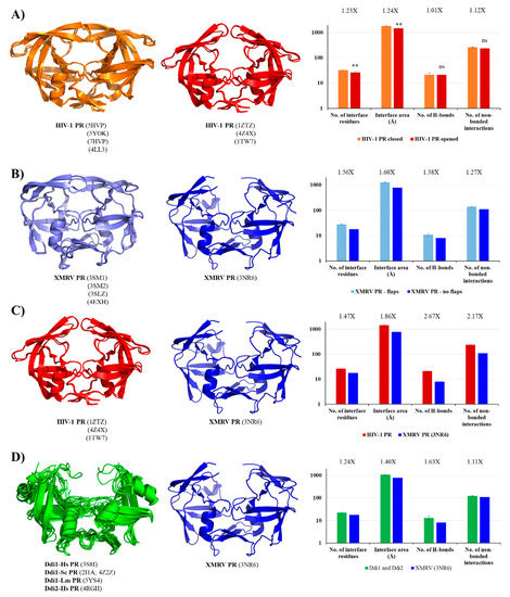 Comparison of contact maps. (A) Contact maps of HIV-1 PR structures. Structures and contact numbers are shown for HIV-1 PR in the closed and opened conformations (orange and red, respectively). (B) Contact maps of XMRV PR structures. Structures and contact numbers are shown for XMRV PR structures either containing or lacking full-length flaps (light and dark blue, respectively). (C) Contact maps of HIV-1 and XMRV PR structures. Structures and contact numbers are shown for the opened conformational HIV-1 PR (orange) and for an XMRV PR lacking full-length flaps in the crystal structure (blue). (D) Contact maps of Ddi and XMRV PR structures. Structures and contact numbers are shown for Ddi PRs (green) and for XMRV PR lacking full-length flaps in the crystal structure (blue). In all cases, the structures are represented based on crystal structures. Graphs shows intermonomeric contacts for the homodimers based on the PDBsum database. Fold differences between the values are shown. In figure part (A), ** indicates that p < 0.01, while ns denotes no statistically significant difference. For figure part (B–D), where a single XMRV PR structure (3NR6) was used for the comparison, statistical analysis was not performed because the sample number was only 1.
