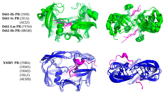 Despite the low sequence identity between the target and template structures, retroviral and retroviral-like PRs exhibit high structural similarity [5], which makes the homology modeling of retroviral-like PRs possible. Before the deposition of the first Ddi1-Lm crystal structure to the PDB in 2017 [8], model structures were previously prepared for Ddi1-like PR of L. major [5,12,13], and the PRs of Schistosoma mansoni and Hymenolepis microstoma [13].