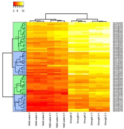 Heat map showing genes upregulated during drought. A total of 63 genes (Table S1) upregulated during drought stress and four clusters were obtained by using expression spectrum. In order to obtain optimal drought-responsive genes, the intersection of genes upregulated in both studies (ZT0, Z4 []; and R2, V6 []) was finally used as the final candidate drought corresponding genes. By processing the chip data in the literature [] to obtain the drought-responsive gene expression profiles under different conditions, and then clustering the expression profiles to obtain four clusters.