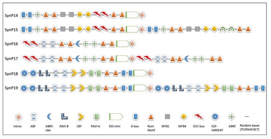 Empirical design of synthetic assemblies. All six promoters (SynP14–SynP19) comprised of 11 multiple cis motifs (colored shapes) spaced by random bases (black line) and a root motif. SynP14 contained multiple drought-inducible cis motifs upstream of 35S minimal promoter while SynP15 contained same synthetic module both at the upstream and downstream of 35S minimal promoter region. SynP16 contained another set of drought-inducible cis motifs. SynP17 contained same synthetic module both at upstream and downstream of the 35S minimal promoter region. SynP18 is the third set of cis motifs active against drought stress. Synp19 contained same synthetic module both at the upstream and downstream of 35S minimal promoter region.