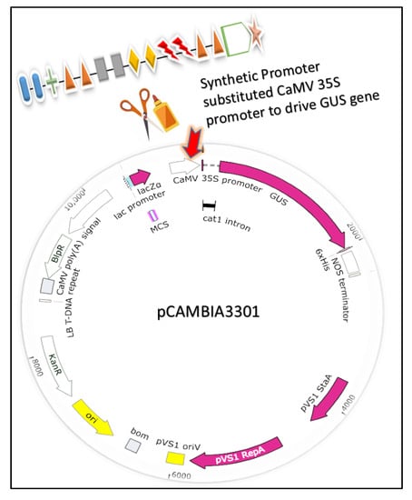 Schematic representation of the construction of expression cassette. Synthetic promoter was inserted by replacing the 35s promoter among the NcoI and HindIII restriction sites in pCAMBIA3301.