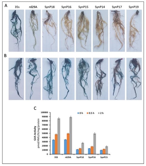 For regeneration of hairy roots, we infected 5-day old cotyledons (G. max cv Jiyu 72) seedlings with K599 transformants harboring the constructs as mentioned [,]. Two weeks after infection, hairy root had regenerated and were confirmed (whether transgenic) through PCR using synthetic promoter-specific primers. When the transgenic hairy roots were long and strong enough to support the plants, the primary roots were removed. The chimeric plants were rooted in fresh vermiculite and allowed to grow until hairy roots were ~10 cm long. One set of transgenic hairy roots were subjected to GUS histochemical analysis before drought treatment, while another set of transgenic hairy roots was put forward to GUS staining after PEG treatment of chimeric plants. Transgenic hairy roots were excised from ~30 days old chimeric plants for histochemical GUS assay in order to check the inducibility of synthetic promoters against drought. Without drought treatment, no staining was found for any synthetic promoter except 35S control (Figure 6A).