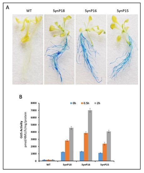 Functional validation of synthetic promoters in Arabidopsis. The three synthetic promoters (SynP15, SynP16, and SynP18), which displayed efficient drought inducibility in soybean hairy roots were further validated in Arabidopsis through their Agrobacterium tumefacians-mediated transformation (WT Arabidopsis as negative control). (A) WT as well as transgenic Arabidopsis were subjected to GUS histochemical assay after treating with 20% PEG6000 for 24 h. (B) GUS fluorometric analysis of WT and transgenic Arabidopsis.