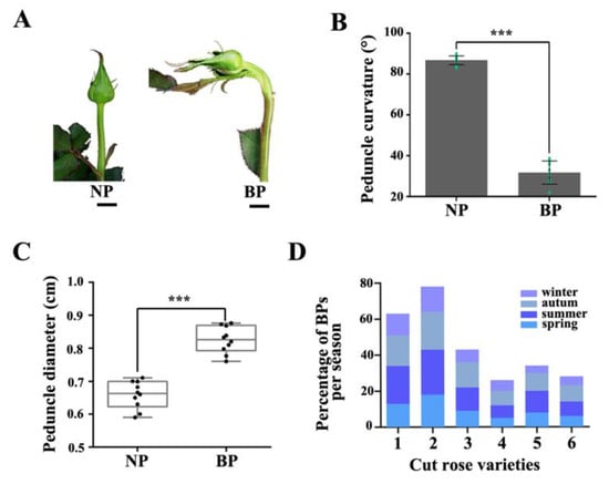 - Seo, J.H.; Kim, W.S. Growth, Floral Morphology, and Phytohormone Levels of Flowering Shoots with Bent Peduncle in Greenhouse-grown Cut Rose ‘Beast’. Korean J. Horticult. Sci. Tech. 2013, 31, 714–719. [Google Scholar] [CrossRef][Green Version]