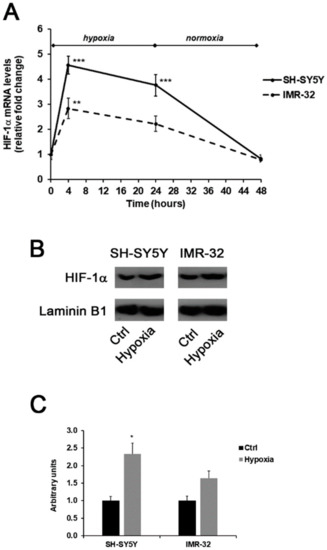 In this experimental study, the generation of a hypoxic environment induced the up-regulation of HIF-1α in both SH-SY5Y and IMR-32 cells. As shown in Figure 1A, hypoxia immediately induced a significant increase of about 4.5-folds in HIF-1α mRNA levels in SH-SY5Y cells in comparison to unexposed cells. Also, in IMR-32 cells the expression of HIF-1α increased after 4h of hypoxia, although at a less extent in comparison to SH-SY5Y cells. In both cell lines, HIF-1α mRNA levels returned to basal levels after 24 h of reoxygenation (Figure 1A). In addition, after 4 h of hypoxia the nuclear protein content of HIF-1α was increased in both cell lines (Figure 1B,C).